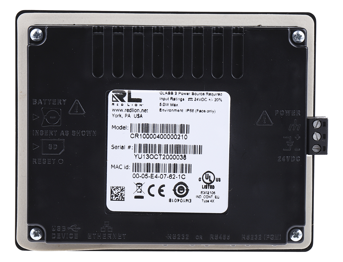 This is Controls CR1000 Series Touch Screen HMI 4.3 in Color 480 x 272pixels manufactured by Red Lion. The manufacturer part number is CR10000400000210. It features a remarkable colour display. This product features 4 number of ports. The given dimensions of the product include 130.65 x 104.69 x 38.1 mm. It is IP rated with ip66. It supports a/an ethernet, serial type port . Its accurate length is 130.65mm. The product is designed with a standard 480 x 272 display resolution . Furthermore, the product is 104.69mm wide. The product comes in 38.1mm depth. Features 24 v dc supply voltage. Whereas, the minimum operating temperature of the product is -10°c. The product has an assigned cr10000400000210 manufacturer part number. It has a maximum operating temperature of +50°c. It is tailored with a standard 4.3 in size display . The product has a cr1000 manufacturer series.