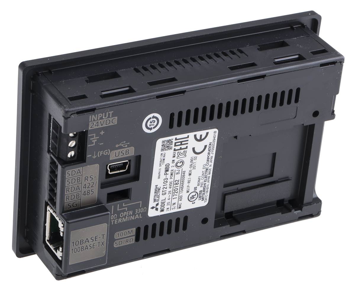 This is Mitsubishi GT21 Series GOT2000 Touch Screen HMI - 3.8 in LCD Display manufactured by Mitsubishi Electric. The manufacturer part number is GT2103-PMBD. It features a remarkable lcd display. This product features 4 number of ports. It has an attractive monochrome colour display . The given dimensions of the product include 113 x 74 x 32 mm. It is IP rated with ip2x, ip67f. It supports a/an ethernet, rs485/rs422, sd card interface, usb type port . Its accurate length is 113mm. The product has a gt21 manufacturer series. Furthermore, the product is 74mm wide. The product comes in 32mm depth. Additionally, it has a/an got2000 product range . It has a backlighting feature yes . Whereas, the minimum operating temperature of the product is 0°c. It is designed with 3 mb onboard memory . The product has an assigned gt2103-pmbd manufacturer part number. It has a maximum operating temperature of +55°c. It is tailored with a standard 3.8 in size display . Features 24 v dc supply voltage.