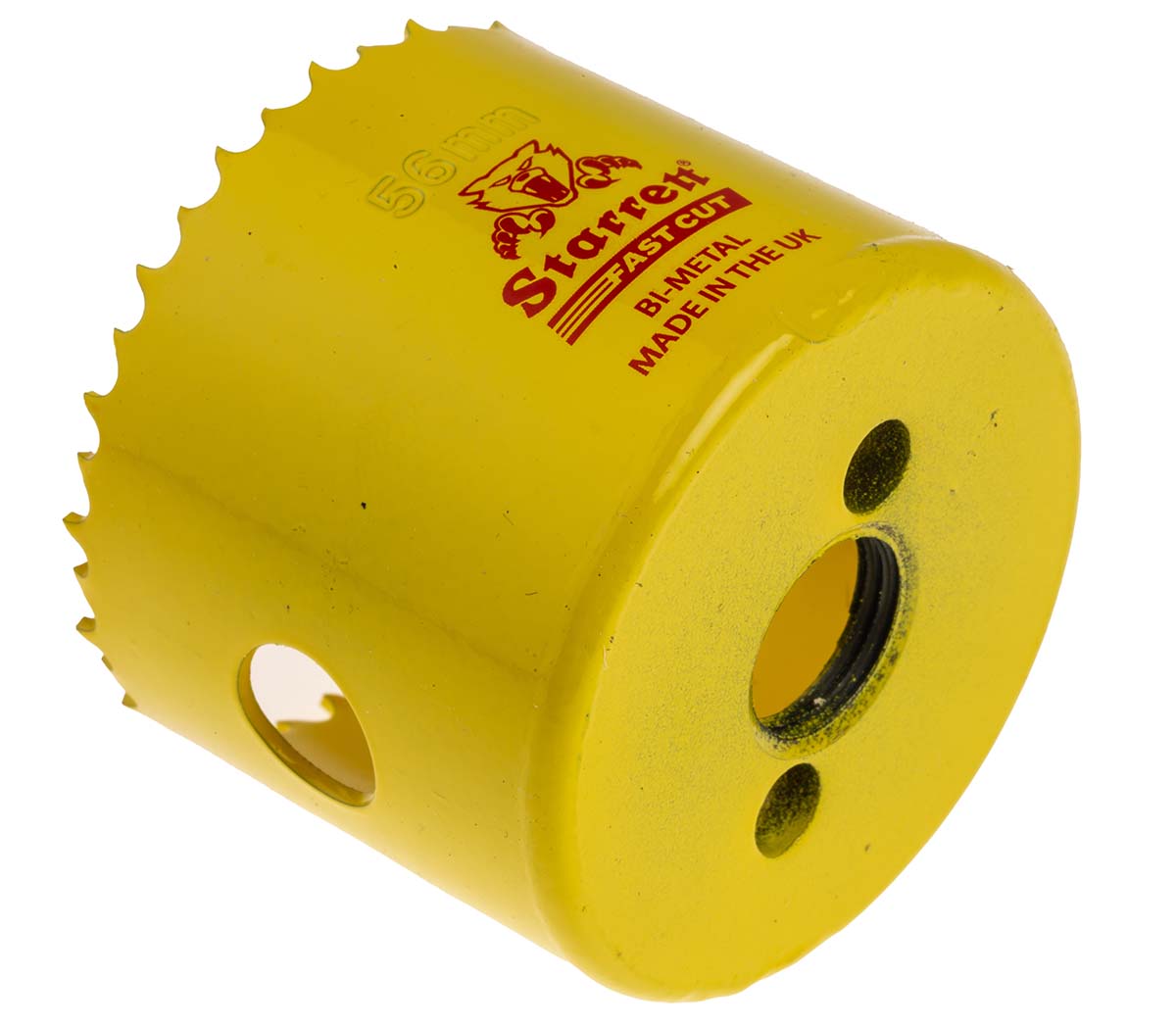 This is HSS 56mm Hole Saw manufactured by Starrett. The manufacturer part number is FCH056M-G. Its diameter is 56mm. The product is made from highly stable and reliable hss. It has a/an hole saw type drill bit . It includes an arbor no . Additionally, it has about 38mm cut depth . The product consists of 1 pieces.
