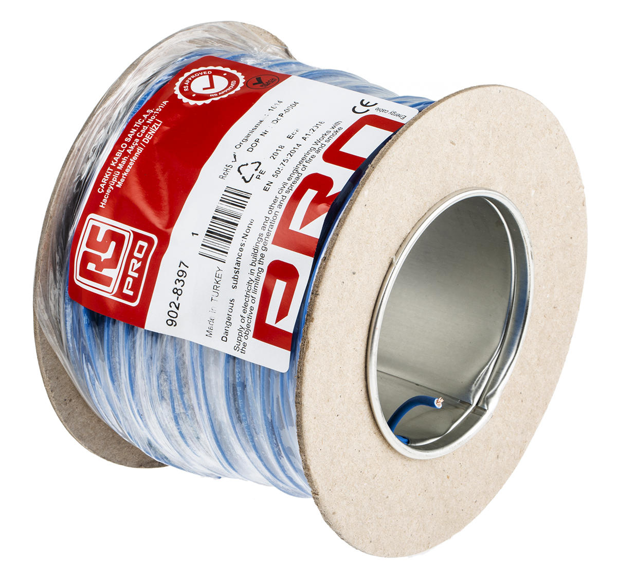 This is 1 Core 1.5 mm² Power Cable Blue Polyvinyl Chloride PVC Sheath 100m 750 V H07V-K manufactured by RS Pro. The manufacturer part number is 902-8397. Features 16 awg - American Wire Gauge. The product has a current rating of 24a. Its harmonised code is h07v-k . Whereas the outer sheath is manufactured from pvc material. Its outer diameter is 3.4mm. Additionally, it contains 27 strands. The product complies with all safety standards, such as iec 60332-1. Moreover, this cable has a round shape. The core strands are 27/0.25 mm. It has a maximum operating temperature of +70°c. The product has 1.5mm² cross section area. Moreover, the product has a nominal 750 v voltage rating. The product has a flame retardant fire behaviour. Its accurate length is 100m. The conductor is made from copper material. The product h07v-k, is a highly preferred choice for users. The strand size includes 0.25mm. The sheath has an adorable blue colour. It has a robust pvc insulation material. It has h07v-k European harmonized code .