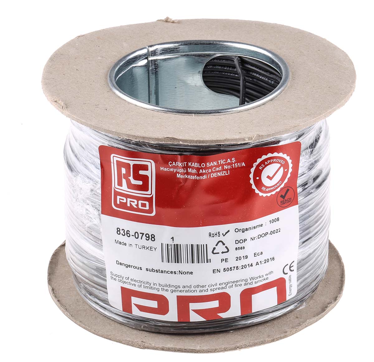 This is Black 100m Polyolefin Cross-linked EI5 Type EI 5 to EN 50363-5 Equipment Wire 1.5 mm² CSA 750 V 15 AWG manufactured by RS Pro. The manufacturer part number is 836-0798. Features 15 awg - American Wire Gauge. The product complies with all safety standards, such as euroclass eca. Moreover, the product has a nominal 750 v voltage rating. The conductor is made from copper material. Moreover, this cable has a round shape. It has h07z-k European harmonized code . The sheath has an adorable black colour. The insulated wall has 0.7mm thick. Its accurate length is 100m. It has a robust polyolefin cross-linked ei5, type ei 5 to en 50363-5 insulation material. Whereas, the minimum operating temperature of the product is -5°c. It has a maximum operating temperature of +90°c. The product has 1.5 mm² cross section area.