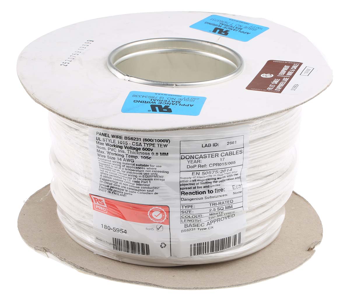 This is White Switchgear & Tri-rated Cable 2.5 mm² CSA 1 kV dc 600 V ac 30 A 100m manufactured by RS PRO. The manufacturer part number is 180-5954. The product has a current rating of 30 a. Moreover, the product has a nominal 1 kv dc, 600 v ac voltage rating. The conductor is made from copper material. It has a maximum operating temperature of +105°c. The wire has a ul1015 style. The product has a flame retardant fire behaviour. The core strands are 50/0.25 mm. The sheath has an adorable white colour. Its accurate length is 100m. It is tri-rated yes . The product has 2.5 mm² cross section area. Additionally, it contains 50 strands. Its outer diameter is 3.7mm. The strand size includes 0.25 mm.