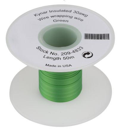 This is Green 50m Kynar Equipment Wire 0.05 mm² CSA 300 V 30 AWG manufactured by RS Pro. The manufacturer part number is 209-4833. Features 30 awg - American Wire Gauge. The product complies with all safety standards, such as rohs compliant. Moreover, this cable has a single core shape. The conductor is made from silver plated copper material. It has a maximum operating temperature of +130°c. Moreover, the product has a nominal 300 v voltage rating. The core strands are 1/0.25 mm. The sheath has an adorable green colour. The insulated wall has 0.5mm thick. Its accurate length is 50m. It has a robust kynar insulation material. Whereas, the minimum operating temperature of the product is -20°c. Its outer diameter is 0.5mm. The product has 0.05 mm² cross section area.