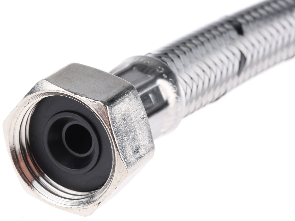 This is 300mm Long EPDM 15 bar Braided Stainless Steel Hose manufactured by RS Pro. The manufacturer part number is 711-8442. epdm is the liner material of the product . It provides up to 15 bar maximum working pressure. The product is made from highly stable and reliable brass, epdm. Furthermore, it is suitable for cold water, hot water applications . In addition, it has compression as thread standard or connection type 2 . Its accurate length is 300mm. With bsp thread standard or connection type 1 . With a 15mm connection size 2 . It has about 1/2in connection size 1 . Its connection 1 is of female gender .