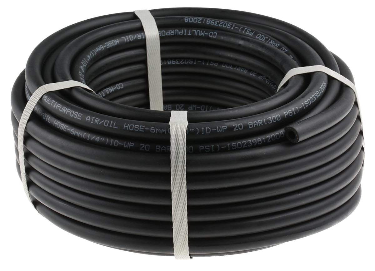This is Black 25m NBR SBR Air Hose Application Compressed Air Tools manufactured by RS Pro. The manufacturer part number is 914-5540. The product complies with all safety standards, such as iso 2398. It provides up to 20 bar maximum working pressure. It has a maximum operating temperature of +90°c. It has a decent black colour. The product is made from highly stable and reliable nbr. Its accurate length is 25m. Whereas, the minimum operating temperature of the product is -40°c. The inner diameter of the product is 6mm. Its hose pipe action is transfer . Its outer diameter is 12mm. Furthermore, it is suitable for compressed air applications .
