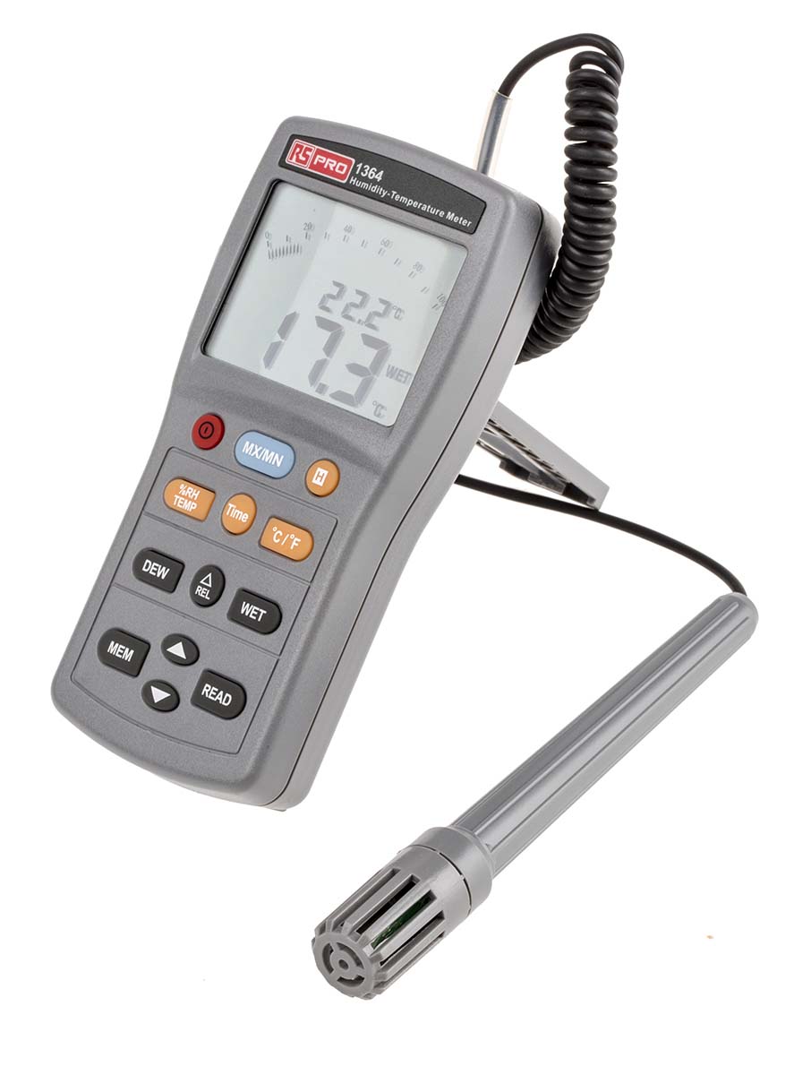 This is RS1364 Thermohygrometer +140 °F +60 °C With UKAS Calibration manufactured by RS PRO. The manufacturer part number is 123-2270. Included functions dew point, hold, maximum & minimum display, record, relative, wet bulb . A bespoke product is a robust handheld meter with various applications. Moreover, the product gets power from battery. The typical product's weight is 235g. It has about ±3 %rh best humidity measurement accuracy . While it has rs1364 of model number. It has a dew point measurement feature yes . It has a 0.1 °f, 0.1 °c temperature measurement resolution . In addition, it has 0.1%rh humidity measurement resolution . It has about ±0.5 °c, ±0.9 °f best temperature measurement accuracy . It is calibrated ukas . Its battery life is about 200 h . Whereas, the minimum operating temperature of the product is 0°c. This aaa battery is comparatively much efficient than common batteries. It has a digital hygrometer . It has a maximum operating temperature of +60°c. Additionally, it has a maximum 95%rh humidity measurement . Whereas, the absolute maximum temperature measurement is +140 °f, +60 °c .