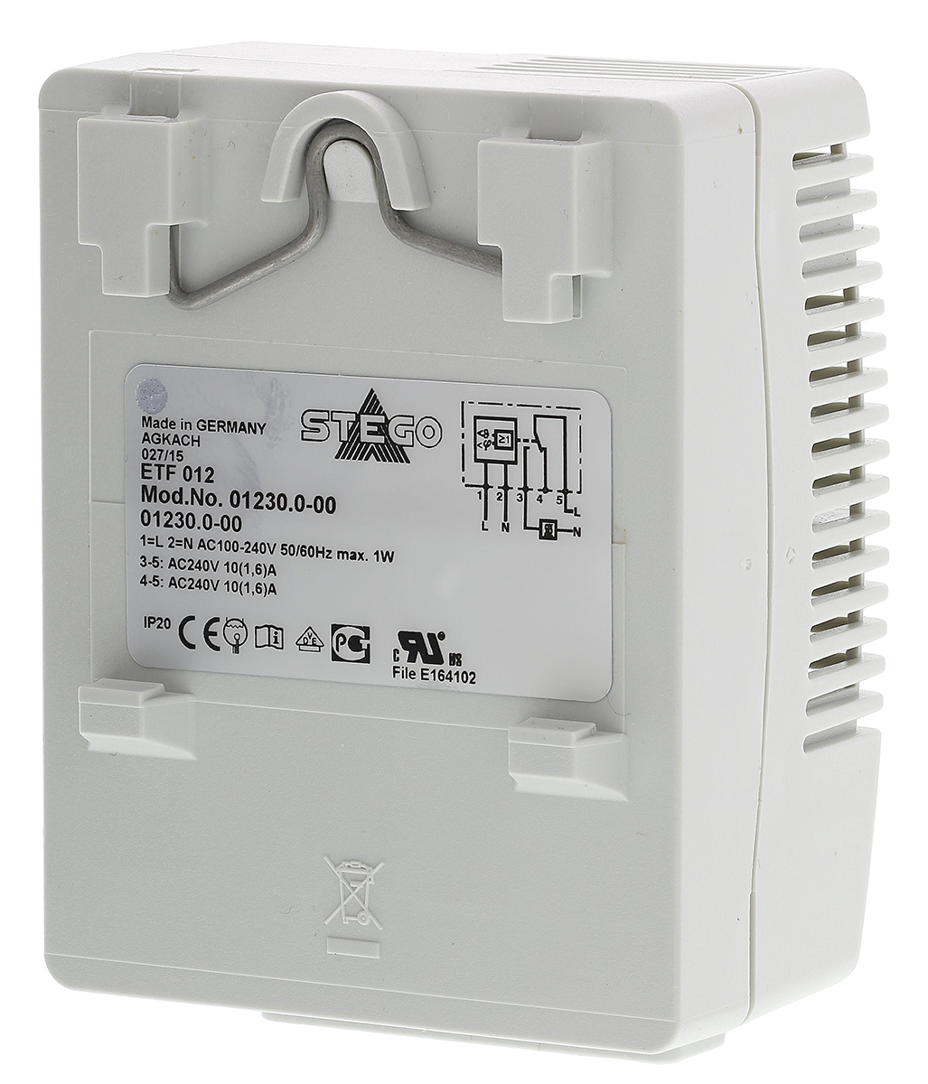 This is Enclosure Thermo Hygrostat Changeover 0 → +60°C 50 → 90%RH 100 → 240 V ac manufactured by STEGO. The manufacturer part number is 01230.0-00. It has a maximum humidity setting of 90%rh . It is offered with a 50%rh minimum humidity setting . It has an activation humidity of 50 → 90%rh . Features 100 → 240 v ac supply voltage.
