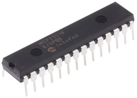 This is I/O Expander 28-Pin SPDIP manufactured by Microchip. The manufacturer part number is MCP23S18-E/SP. It is comprised of 28 pins. The package is a sort of spdip. The product is available in through hole configuration.