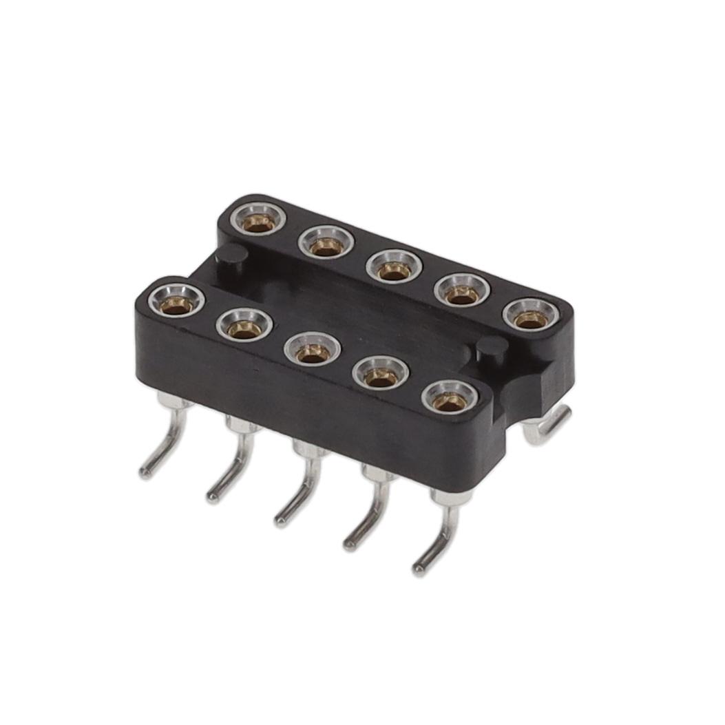 This is manufactured by Mill-Max Manufacturing Corp.. The manufacturer part number is 110-43-210-41-105000. It has possible tin contact post finishing. It is assigned with possible HTSUS value of 8536.69.4040. The product is rohs3 compliant. The product also features robust polycyclohexylenedimethylene terephthalate (pct), polyester housing material. The product has -55°c ~ 125°c operating temperature range. The product is supplied with 10 (2 x 5) positions/pins. Additionally, it features 200.0µin (5.08µm) of post thickness. Its contact is manufactured from highly durable beryllium copper. It comes in dip, 0.2" (5.08mm) row spacing configuration. In addition, it is reach unaffected. The mill-max manufacturing corp.'s product offers user-desired applications. The post (contact material) is designed from high stable brass alloy. It has nice contact finishing of gold. Its typical moisture sensitivity level is 1 (unlimited). The product features solder termination style. It has a long 2 weeks standard lead time. It has 0.100" (2.54mm) of pitch-mating value. The splendid features of the product include open frame. The product is available in surface mount configuration. The product 110, is a highly preferred choice for users. In addition, tube is the available packaging type of the product. However, 30.0µin (0.76µm) is the "Contact Finish Thickness - Mating" of the product. The product is designated with the ear99 code number. Moreover, it corresponds to 110-43, a base product number of the product. The given pitch of the item is 0.100" (2.54mm).