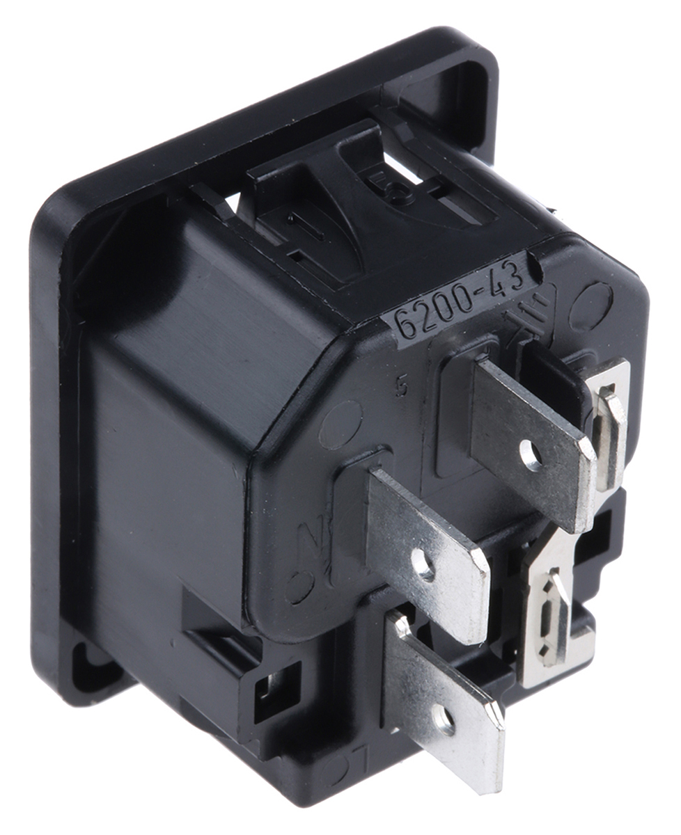 This is C14 Snap-In IEC Plug manufactured by Schurter. The manufacturer part number is 6200.4315. The product has a current rating of 10a. The product is available in snap-in configuration. Moreover, the product has a nominal 250 v voltage rating. In addition, male is the available "Gender" of the product. It has straight body orientation. Additionally, it has a/an c14 type IEC connector .