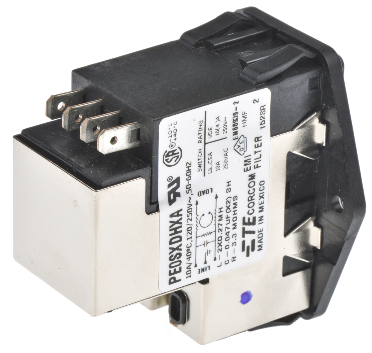 This is Male C14 IEC Filter Flange Mount 5 x 20mmSpadeRated At 10A120 V ac 250 V ac Operating Frequency 50 Hz 60 Hz manufactured by TE Connectivity. The manufacturer part number is 6609929-4. Fuses included 2 . The product has a current rating of 10a. The product is available in flange mount configuration. Moreover, the product has a nominal 120 v ac, 250 v ac voltage rating. In addition, male is the available "Gender" of the product. A fuse with a 5 x 20mm size. In addition, the height is 58.67mm. Furthermore, the product is 50.29mm wide. The product comes in 55.63mm depth. Additionally, it has a/an c14 type IEC connector . It allows spade termination method. Furthermore, the product has 50 hz, 60 hz operating frequency range. Quality product with a 2 pole switch type.