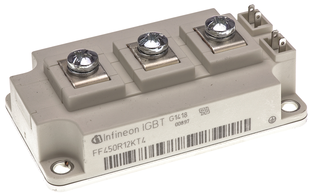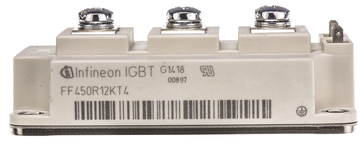 This is 62MM Module Series IGBT Module 580 A max 1200 V Panel Mount manufactured by Infineon. The manufacturer part number is FF450R12KT4HOSA1. The given dimensions of the product include 106.4 x 61.4 x 30.9mm. The product is available in panel mount configuration. Provides up to 2.4 kw maximum power dissipation. Whereas features a 1200 v of collector emitter voltage (max). The product is available in [Cannel Type] channel. The product has a maximum 580 a continuous collector current . It offers a maximum ±20v gate emitter voltage . The package is a sort of 62mm module. Whereas, the minimum operating temperature of the product is -40 °c. The product is available in series configuration. It has a maximum operating temperature of +150 °c. It contains 3 pins. The product offers series transistor configuration.