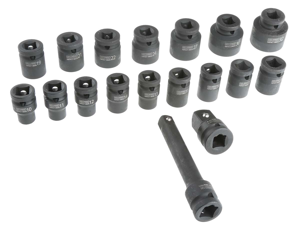 This is 1/2 in Drive Impact Socket Set Square manufactured by RS Pro. The manufacturer part number is 125-3055. It is available in metric package. A quality product with a nice phosphate finish. The product features a square drive. The product is made from highly stable and reliable chrome molybdenum steel. The socket's size is 10 → 32mm. The product has a drive size of 1/2 in. The product consists of 18 pieces.