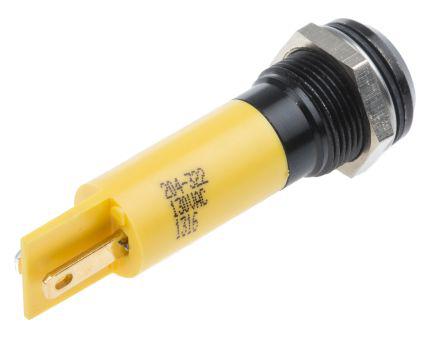 This is Prominent Indicator Panel Mount 12mm Mounting Hole Size Yellow LED Tab Termination 8 mm Lamp Size 130 V ac manufactured by RS Pro. The manufacturer part number is 204-322. Regarding light output colour, it outputs yellow light colour. Its lamp is 8 mm in size . In addition, It features 12mm of mounting hole size. It is IP rated with ip67. Furthermore, the bezel has a classic black colour. Moreover, the product has a nominal 130 v ac voltage rating. The given intensity of the product is 120 mcd. Its accurate length is 56 mm. The bezel features a prominent style. The product is designed with a tab termination. The product has a current rating of 6 ma. It is a type of led lamp.