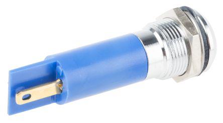 This is Blue LED Indicator 130 V ac 8 mm Lamp Size 12mm Mounting Hole Size IP67 manufactured by RS Pro. The manufacturer part number is 204-906. Regarding light output colour, it outputs blue light colour. Its lamp is 8 mm in size . In addition, It features 12mm of mounting hole size. It is IP rated with ip67. Furthermore, the bezel has a classic chrome colour. Moreover, the product has a nominal 130 v ac voltage rating. The given intensity of the product is 80 mcd. Its accurate length is 56 mm. The bezel features a prominent style. The product is designed with a tab termination. The product has a current rating of 6 ma. It is a type of led lamp.