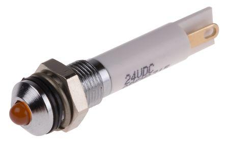 This is Orange LED Indicator 21.6 → 26.4 V dc 7 mm Lamp Size 6mm Mounting Hole Size IP67 manufactured by RS Pro. The manufacturer part number is 843-2433. Priced to Clear Options - yes. Regarding light output colour, it outputs orange light colour. Its lamp is 7 mm in size . In addition, It features 6mm of mounting hole size. It is IP rated with ip67. Furthermore, the bezel has a classic chrome colour. Moreover, the product has a nominal 21.6 → 26.4 v dc voltage rating. The given intensity of the product is 60 mcd. Its accurate length is 26.6 mm. The bezel features a prominent style. The product is designed with a solder lug termination. The product has a current rating of 20 ma. It is a type of led lamp.