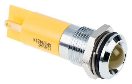 This is Prominent Indicator Panel Mount 14mm Mounting Hole Size Yellow LED Faston Solder Lug Termination 10 mm Lamp Size manufactured by RS Pro. The manufacturer part number is 848-4529. Priced to Clear Options - yes. Regarding light output colour, it outputs yellow light colour. Its lamp is 10 mm in size . In addition, It features 14mm of mounting hole size. It is IP rated with ip67. Furthermore, the bezel has a classic chrome colour. Moreover, the product has a nominal 110 v ac voltage rating. The given intensity of the product is 2500 mcd. Its accurate length is 38.5 mm. The bezel features a prominent style. The product is designed with a faston, solder lug termination. The product has a current rating of 6 ma. It is a type of led lamp.