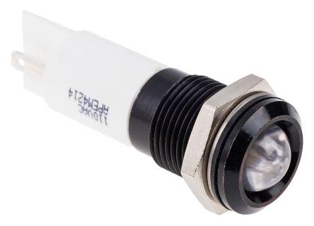This is Prominent Indicator Panel Mount 14mm Mounting Hole Size White LED Faston Solder Lug Termination 10 mm Lamp Size manufactured by RS Pro. The manufacturer part number is 848-4557. Priced to Clear Options - yes. Regarding light output colour, it outputs white light colour. Its lamp is 10 mm in size . In addition, It features 14mm of mounting hole size. It is IP rated with ip67. Furthermore, the bezel has a classic black chrome colour. Moreover, the product has a nominal 110 v ac voltage rating. The given intensity of the product is 1900 mcd. Its accurate length is 38.5 mm. The bezel features a prominent style. The product is designed with a faston, solder lug termination. The product has a current rating of 6 ma. It is a type of led lamp.