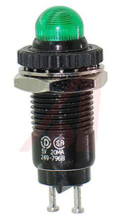 This is Green LED Indicator 5 V dc 9.53mm Mounting Hole Size manufactured by Dialight. The manufacturer part number is 249-7968-3732-504F. Regarding light output colour, it outputs green light colour. The product has a current rating of 20 ma. In addition, It features 9.53mm of mounting hole size. Moreover, the product has a nominal 5 v dc voltage rating. Furthermore, the bezel has a classic black colour. The given intensity of the product is 100 mcd. Its accurate length is 31 mm. The bezel features a prominent style. The product is designed with a solder turret termination. It is a type of led lamp.