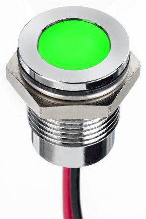 This is Green Indicator 110 V ac 10 mm Lamp Size 14mm Mounting Hole Size IP67 manufactured by RS Pro. The manufacturer part number is 130-2265. Regarding light output colour, it outputs green light colour. Its lamp is 10 mm in size . In addition, It features 14mm of mounting hole size. It is IP rated with ip67. Furthermore, the bezel has a classic chrome colour. Moreover, the product has a nominal 110 v ac voltage rating. The given intensity of the product is 250 mcd. Its accurate length is 19.4 mm. The bezel features a flush style. The product is designed with a lead wires termination. The product has a current rating of 6 ma. It is a type of led lamp.