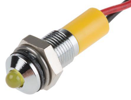 This is Yellow Indicator 12 V dc 3 mm Lamp Size 6mm Mounting Hole Size IP67 manufactured by RS Pro. The manufacturer part number is 722-7782. Regarding light output colour, it outputs yellow light colour. Its lamp is 3 mm in size . In addition, It features 6mm of mounting hole size. It is IP rated with ip67. Furthermore, the bezel has a classic chrome colour. Moreover, the product has a nominal 12 v dc voltage rating. The given intensity of the product is 30 mcd. Its accurate length is 17.1 mm. The bezel features a prominent style. The product is designed with a lead wires termination. The product has a current rating of 20 ma. It is a type of led lamp.