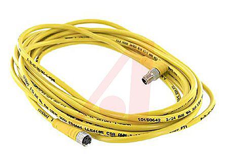 This is Cable assembly with a M8 Socket and a M8 Plug 4 A 125 V ac/dc IP67 manufactured by Turck. The manufacturer part number is PKG 3M-5-PSW 3M. Features 24 awg - American Wire Gauge. The product has a current rating of 4 a. The sheath is constructed from durable and adorable polyvinyl chloride pvc material. Its connector B housing is of plug gender . It is IP rated with ip67. While the connector B is m8. It has a maximum operating temperature of +105°c. Moreover, the product has a nominal 125 v ac/dc voltage rating. The connector A is m8 connector. The sheath has an adorable yellow colour. The conductor is made from brass material. It has a robust pvc insulation material. Whereas, the minimum operating temperature of the product is -40°c. The product consists of 3 cores. On the other hand, the connector's housing (A) is a socket. Its outer diameter is 9.6 (end1) mm, 9.6 (end2) mm.