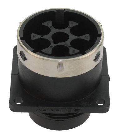 This is UTG Series 7 Pole Panel Mount Circular Connector Socket with Male Contacts manufactured by Souriau. The manufacturer part number is UTG0187PVDEU. It is a type of bayonet mating. The product is available in panel mount configuration. The product utg, is a highly preferred choice for users. It has straight body orientation. It allows crimp termination method. This male contact is widely suited for specific applications. The product also features robust thermoplastic housing material. It comprises a socket. The connector has standard size. The shell has 18 size. The product contains 7 contacts.
