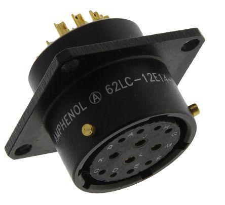 This is 62LC Series 12 Pole Panel Mount Connector Socket with Female Contacts manufactured by Amphenol. The manufacturer part number is 62LC-12E14-12SN(771). The product has a current rating of 13.0a. It is a type of bayonet mating. The product is available in panel mount configuration. Moreover, the product has a nominal 700.0 v voltage rating. The product 62lc, is a highly preferred choice for users. It has straight body orientation. It allows solder termination method. This female contact is widely suited for specific applications. The product also features robust aluminium housing material. It comprises a socket. The high-quality gold is used as contact plating material. The shell has 14 size. The product contains 12 contacts. The product is made from sturdy copper materials.