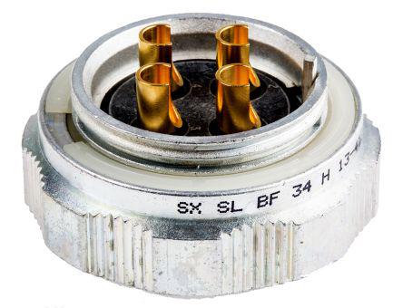 This is SL61 Series 4 Pole Cable Mount Connector manufactured by Amphenol. The manufacturer part number is SL BF 34 H. The product has a current rating of 50.0a. The product is available in cable mount configuration. Moreover, the product has a nominal 500.0 v voltage rating. The product sl61, is a highly preferred choice for users. It has straight body orientation. This female contact is widely suited for specific applications. It comprises a socket. The high-quality gold is used as contact plating material. It allows solder termination method. The product contains 4 contacts. The connector has standard size.