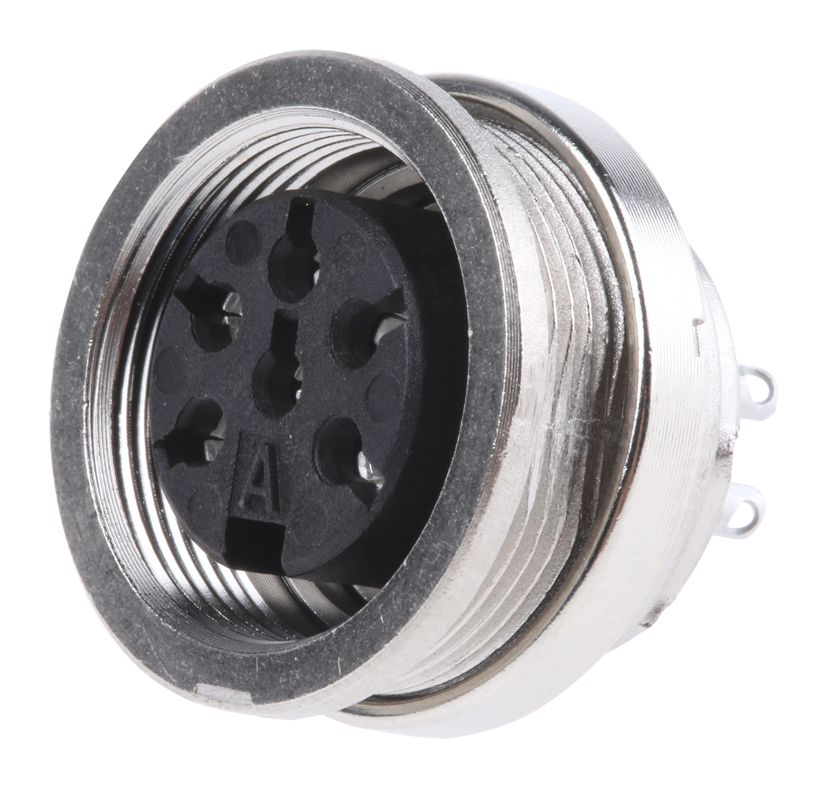 This is Amphenol C 091 A Series Female Panel Mount Connector 6 contacts Socket manufactured by Amphenol Industrial. The manufacturer part number is T3403 000 RS. The product has a current rating of 5.0a. It is a type of screw on mating. The product is available in panel mount configuration. It is IP rated with ip40. The product signalmate c091, is a highly preferred choice for users. It has straight body orientation. Moreover, the product has a nominal 300 v voltage rating. The product also features robust metal, polymer housing material. The high-quality silver is used as contact plating material. It allows solder termination method. The product contains 6 contacts. It has a maximum operating temperature of +85°c. Whereas, the minimum operating temperature of the product is -40°c. The connector has m16 size.