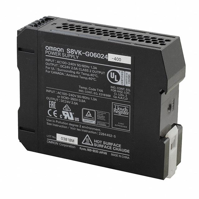 This is manufactured by Omron Automation and Safety. The manufacturer part number is S8VK-G06024-400. It is assigned with possible HTSUS value of 8504.40.6018. The product is rohs3 compliant. It has a 24v output voltage. The product features power and watts of 60w. The maximum product's output current is 2.5a. It is approved by ce, culus, curus, tuv. It carries ac input type. The product is widely employed in ite (commercial). In addition, it is reach unaffected. It is a highly efficient product with an 88% of high efficiency. It is shipped in bulk package . The product's diameters include 4.33" l x 1.26" w x 3.54" h (110.0mm x 32.0mm x 90.0mm). It has a long 13 weeks standard lead time. 3 kv of isolation voltage. The product has an AC input voltage range of 85 ~ 264 vac. Its typical moisture sensitivity level is not applicable. The splendid features of the product include adjustable output, pfc, universal input. The product s8vk-g (60w), is a highly preferred choice for users. The product has -40°c ~ 70°c (with derating) operating temperature range. Moreover, it corresponds to s8vk-g060, a base product number of the product. Additionally, the product is supplied with 1 outputs. The product is designated with the ear99 code number.
