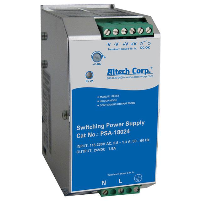 This is manufactured by Altech Corporation. The manufacturer part number is PSA-18024. It is assigned with possible HTSUS value of 8504.40.9530. The product is rohs3 compliant. It has a 24v output voltage. The product features power and watts of 180w. The maximum product's output current is 7.5a. It is approved by ce, culus. It carries ac input type. The product is widely employed in industrial, ite (commercial). In addition, it is reach unaffected. It is a highly efficient product with an 91% of high efficiency. The altech corporation's product offers user-desired applications. The product's diameters include 4.06" l x 2.17" w x 4.57" h (103.0mm x 55.0mm x 116.0mm). 3 kv of isolation voltage. The product has an AC input voltage range of 90 ~ 135 vac, 180 ~ 264 vac. Its typical moisture sensitivity level is not applicable. The splendid features of the product include adjustable output. The product psa-180 (180w), is a highly preferred choice for users. The product has -25°c ~ 70°c (with derating) operating temperature range. In addition, box is the available packaging type of the product. Standard number include: 508; 60950-1. Additionally, the product is supplied with 1 outputs. The product is designated with the ear99 code number.