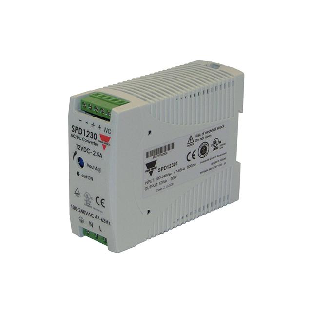 This is manufactured by Carlo Gavazzi Inc.. The manufacturer part number is SPD12301. It is assigned with possible HTSUS value of 8504.40.6018. Additionally, the product is supplied with 1 outputs. It has a 12v output voltage. The product features power and watts of 30w. The maximum product's output current is 2.5a. It is approved by ccc, ce, culus, curus, tuv. It carries ac or dc input type. The product is widely employed in hazardous locations, industrial, ite (commercial). In addition, it is reach unaffected. It is a highly efficient product with an 84% of high efficiency. It has 375v of maximum DC input voltage. It is shipped in box package . While the minimum DC input voltage is 90v. Does it require minimum load? no. The product's diameters include 4.49" l x 1.59" w x 3.54" h (114.0mm x 40.5mm x 90.0mm). The product has an AC input voltage range of 85 ~ 264 vac. Its typical moisture sensitivity level is not applicable. The splendid features of the product include adjustable output, ip20, universal input. The product spd (30w), is a highly preferred choice for users. The product has -40°c ~ 71°c (with derating) operating temperature range. Moreover, it corresponds to spd12, a base product number of the product. The product is designated with the ear99 code number.