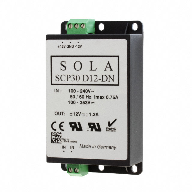 This is SCP DIN Rail Power Supply 30W 12V dc/ 1.2A manufactured by SolaHD. The manufacturer part number is SCP30D12-DN. Additionally, the product is supplied with 2 outputs. Carries <lteq/>1 (ripple) %, <lteq/>2 (noise) % ripple and noise. It carries 1.2a output current. The product complies with all safety standards, such as class ii, cul, en 50082-2, en 55011 class b, en 55022 class b, en 60950, en 61000-4-2, en 61000-4-3, en 61000-4-4, ul 1950, vde 0805. The product is available in din rail mount configuration. The product has +65°c maximum temperature. The product scp, is a highly preferred choice for users. Its electrical phase configuration includes 1. It has ac, dc input voltage. In addition, the height is 120mm. Furthermore, the product is 33mm wide. The product comes in 33mm depth. The MTBF values include 800000h. Features a ±12v dc output voltage. While its minimum temperature is -25°c. It has a/an dc output voltage . Feature 30w of power rating. Its input voltage is 85 → 264v ac. It is assigned with possible HTSUS value of 8504.40.9510. The product is rohs compliant. The product features power and watts of 29w. The maximum product's output current is 1.2a, 1.2a. It is approved by ce, curus. It carries ac or dc input type. It has a 12v output voltage. -12v of voltage output 2. It is a highly efficient product with an 68% of high efficiency. The product is widely employed in ite (commercial). The solahd's product offers user-desired applications. It has 375v of maximum DC input voltage. While the minimum DC input voltage is 100v. Does it require minimum load? yes. The product's diameters include 2.55" l x 1.29" w x 4.71" h (65.0mm x 33.0mm x 120.0mm). The product has an AC input voltage range of 85 ~ 264 vac. Its typical moisture sensitivity level is 1 (unlimited). The splendid features of the product include ip20, universal input. The product scp (30w), is a highly preferred choice for users. The product has -25°c ~ 65°c operating temperature range. In addition, bulk is the available packaging type of the product. Moreover, it corresponds to scp30d12, a base product number of the product. The product is designated with the ear99 code number.