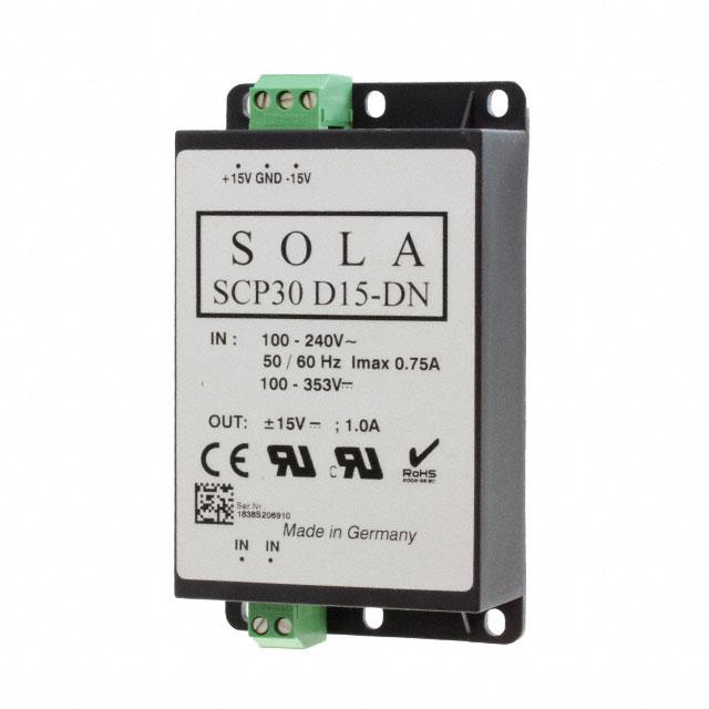This is SCP DIN Rail Power Supply 30W 15V dc/ 1A manufactured by SolaHD. The manufacturer part number is SCP30D15-DN. Additionally, the product is supplied with 2 outputs. Carries <lteq/>1 (ripple) %, <lteq/>2 (noise) % ripple and noise. It carries 1a output current. The product complies with all safety standards, such as class ii, cul, en 50082-2, en 55011 class b, en 55022 class b, en 60950, en 61000-4-2, en 61000-4-3, en 61000-4-4, ul 1950, vde 0805. The product is available in din rail mount configuration. The product has +65°c maximum temperature. The product scp, is a highly preferred choice for users. Its electrical phase configuration includes 1. It has ac, dc input voltage. In addition, the height is 120mm. Furthermore, the product is 33mm wide. The product comes in 33mm depth. The MTBF values include 800000h. Features a ±15v dc output voltage. While its minimum temperature is -25°c. It has a/an dc output voltage . Feature 30w of power rating. Its input voltage is 85 → 264v ac. It is assigned with possible HTSUS value of 8504.40.9510. The product is rohs compliant. The product features power and watts of 30w. The maximum product's output current is 1a, 1a. It is approved by ce, curus. It carries ac or dc input type. The product is widely employed in ite (commercial). It has a 15v output voltage. -15v of voltage output 2. It is a highly efficient product with an 68% of high efficiency. The solahd's product offers user-desired applications. It has 375v of maximum DC input voltage. While the minimum DC input voltage is 100v. The product's diameters include 2.55" l x 1.29" w x 4.71" h (65.0mm x 33.0mm x 120.0mm). The product has an AC input voltage range of 85 ~ 264 vac. Its typical moisture sensitivity level is 1 (unlimited). The splendid features of the product include ip20, universal input. The product scp (30w), is a highly preferred choice for users. The product has -25°c ~ 65°c operating temperature range. In addition, bulk is the available packaging type of the product. Moreover, it corresponds to scp30, a base product number of the product. The product is designated with the ear99 code number.