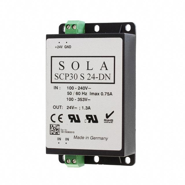 This is SCP DIN Rail Power Supply 30W 24V dc/ 1.3A manufactured by SolaHD. The manufacturer part number is SCP30S24-DN. Additionally, the product is supplied with 1 outputs. Carries <lteq/>1 (ripple) %, <lteq/>2 (noise) % ripple and noise. It carries 1.3a output current. The product complies with all safety standards, such as class ii, cul, en 50082-2, en 55011 class b, en 55022 class b, en 60950, en 61000-4-2, en 61000-4-3, en 61000-4-4, ul 1950, vde 0805. The product is available in din rail mount configuration. The product has +65°c maximum temperature. The product scp, is a highly preferred choice for users. Its electrical phase configuration includes 1. It has ac, dc input voltage. In addition, the height is 120mm. Furthermore, the product is 33mm wide. The product comes in 33mm depth. The MTBF values include 800000h. Features a 24v dc output voltage. While its minimum temperature is -25°c. It has a/an dc output voltage . Feature 30w of power rating. It comes in switched mode configuration. Its input voltage is 85 → 264 v ac / 100 → 375v dc. It is assigned with possible HTSUS value of 8504.40.9510. The product is rohs compliant. The product features power and watts of 31w. The maximum product's output current is 1.3a. It is approved by ce, curus. It carries ac or dc input type. The product is widely employed in ite (commercial). It has a 24v output voltage. It is a highly efficient product with an 77% of high efficiency. The solahd's product offers user-desired applications. It has 375v of maximum DC input voltage. While the minimum DC input voltage is 100v. The product's diameters include 2.55" l x 1.29" w x 4.71" h (65.0mm x 33.0mm x 120.0mm). The product has an AC input voltage range of 85 ~ 264 vac. Its typical moisture sensitivity level is 1 (unlimited). The splendid features of the product include ip20, universal input. The product scp (30w), is a highly preferred choice for users. The product has -25°c ~ 65°c operating temperature range. In addition, bulk is the available packaging type of the product. Moreover, it corresponds to scp30, a base product number of the product. The product is designated with the ear99 code number.