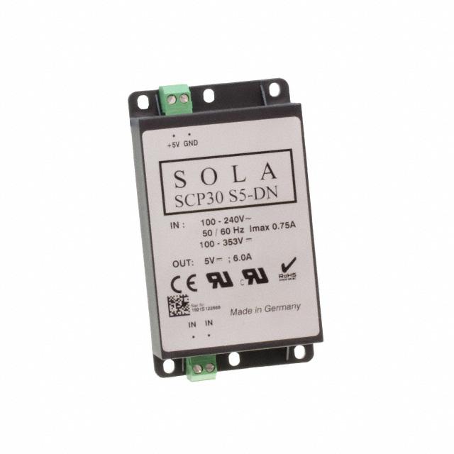 This is SCP DIN Rail Power Supply 30W 5V dc/ 6A manufactured by SolaHD. The manufacturer part number is SCP30S5-DN. Additionally, the product is supplied with 1 outputs. Carries <lteq/>1 (ripple) %, <lteq/>2 (noise) % ripple and noise. It carries 6a output current. The product complies with all safety standards, such as class ii, cul, en 50082-2, en 55011 class b, en 55022 class b, en 60950, en 61000-4-2, en 61000-4-3, en 61000-4-4, ul 1950, vde 0805. The product is available in din rail mount configuration. The product has +65°c maximum temperature. The product scp, is a highly preferred choice for users. Its electrical phase configuration includes 1. It has ac, dc input voltage. In addition, the height is 120mm. Furthermore, the product is 33mm wide. The product comes in 33mm depth. The MTBF values include 800000h. Features a 5v dc output voltage. While its minimum temperature is -25°c. It has a/an dc output voltage . Feature 30w of power rating. Its input voltage is 85 → 264v ac. It is assigned with possible HTSUS value of 8504.40.9510. The product is rohs compliant. The product features power and watts of 30w. The maximum product's output current is 6a. It is approved by ce, curus. It carries ac or dc input type. The product is widely employed in ite (commercial). It has a 5v output voltage. It is a highly efficient product with an 70% of high efficiency. It has 375v of maximum DC input voltage. It is shipped in bulk package . While the minimum DC input voltage is 100v. Does it require minimum load? no. The product's diameters include 2.55" l x 1.29" w x 4.71" h (65.0mm x 33.0mm x 120.0mm). The product has an AC input voltage range of 85 ~ 264 vac. Its typical moisture sensitivity level is 1 (unlimited). The splendid features of the product include ip20, universal input. The product scp (30w), is a highly preferred choice for users. The product has -25°c ~ 65°c operating temperature range. Moreover, it corresponds to scp30, a base product number of the product. The product is designated with the ear99 code number.