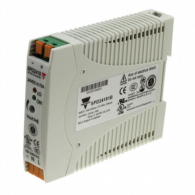 This is manufactured by Carlo Gavazzi Inc.. The manufacturer part number is SPD24181B. It is assigned with possible HTSUS value of 8504.40.9510. Additionally, the product is supplied with 1 outputs. It has a 24v output voltage. The product features power and watts of 18w. The maximum product's output current is 750ma. It is approved by ccc, ce, culus, curus, tuv. It carries ac or dc input type. The product is widely employed in hazardous locations, industrial, ite (commercial). In addition, it is reach unaffected. It is a highly efficient product with an 77% of high efficiency. It has 375v of maximum DC input voltage. It is shipped in box package . While the minimum DC input voltage is 120v. Does it require minimum load? no. The product's diameters include 4.49" l x 0.89" w x 3.54" h (114.0mm x 22.5mm x 90.0mm). 3 kv of isolation voltage. The product has an AC input voltage range of 90 ~ 264 vac. Its typical moisture sensitivity level is not applicable. The splendid features of the product include adjustable output, ip20, universal input. The product spd (18w), is a highly preferred choice for users. The product has -20°c ~ 71°c (with derating) operating temperature range. Moreover, it corresponds to spd24, a base product number of the product. The product is designated with the ear99 code number.