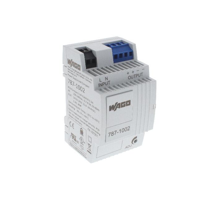 This is manufactured by WAGO Corporation. The manufacturer part number is 787-1002. Moreover, it corresponds to 787-10, a base product number of the product. It is assigned with possible HTSUS value of 8504.40.9510. The product is rohs3 compliant. It has a 24v output voltage. The product features power and watts of 31w. The maximum product's output current is 1.3a. It is approved by curus, ul. It carries ac or dc input type. The product is widely employed in industrial, ite (commercial). In addition, it is reach unaffected. It is a highly efficient product with an 82% of high efficiency. The wago corporation's product offers user-desired applications. It has 373v of maximum DC input voltage. While the minimum DC input voltage is 120v. The product's diameters include 2.32" l x 2.13" w x 3.50" h (59.0mm x 54.0mm x 89.0mm). It has a long 8 weeks standard lead time. 4.242 kv of isolation voltage. The product has an AC input voltage range of 85 ~ 264 vac. Its typical moisture sensitivity level is 1 (unlimited). The splendid features of the product include adjustable output, ip20, pfc, universal input. The product has -25°c ~ 60°c (with derating) operating temperature range. In addition, bulk is the available packaging type of the product. Standard number include: 60950-1; ul 508. Additionally, the product is supplied with 1 outputs. The product is designated with the ear99 code number.