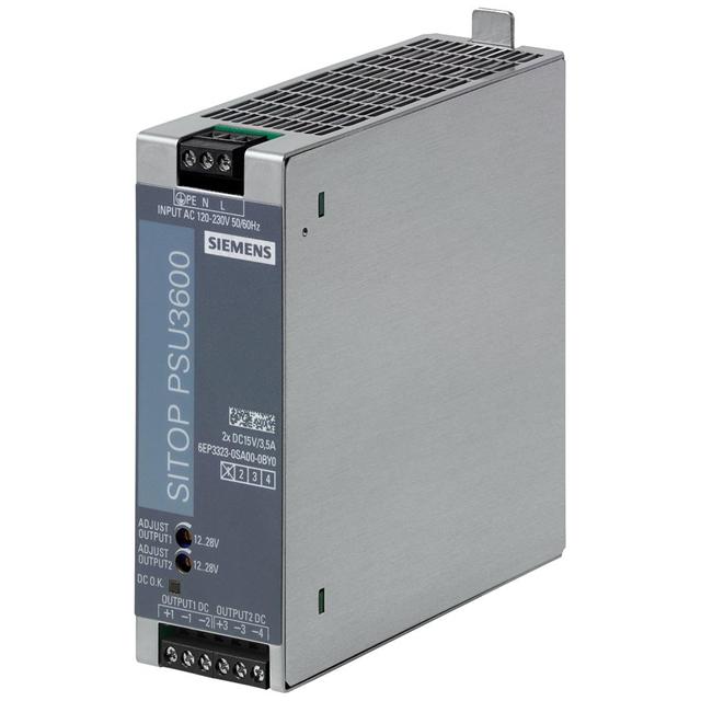 This is manufactured by Siemens. The manufacturer part number is 6EP33230SA000BY0. It is assigned with possible HTSUS value of 8504.40.9520. The product is rohs3 compliant. It has a 15v output voltage. The maximum product's output current is 3.5a, 3.5a. It is approved by ce, culus, eac, ul. It carries ac or dc input type. The product is widely employed in industrial, ite (commercial). In addition, it is reach unaffected. 15v of voltage output 2. It is a highly efficient product with an 88% of high efficiency. The siemens's product offers user-desired applications. It has 250v of maximum DC input voltage. While the minimum DC input voltage is 88v. The product's diameters include 4.92" l x 1.65" w x 4.92" h (125.0mm x 42.0mm x 125.0mm). It has a long 2 weeks standard lead time. The product has an AC input voltage range of 85 ~ 264 vac. Its typical moisture sensitivity level is not applicable. The splendid features of the product include adjustable output, ip20. The product 6ep3, is a highly preferred choice for users. The product has -25°c ~ 70°c operating temperature range. In addition, box is the available packaging type of the product. Standard number include: 60950-1; ul 508. Additionally, the product is supplied with 2 outputs. The product is designated with the ear99 code number.