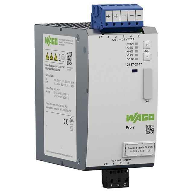This is manufactured by WAGO Corporation. The manufacturer part number is 2787-2147. It is assigned with possible HTSUS value of 8504.40.9530. The product is rohs3 compliant. It has a 24v output voltage. The product features power and watts of 480w. The maximum product's output current is 20a. It is approved by ce, ul. It carries ac or dc input type. The product is widely employed in laboratory. In addition, it is reach unaffected. It is a highly efficient product with an 95.4% of high efficiency. It has 240v of maximum DC input voltage. It is shipped in box package . While the minimum DC input voltage is 130v. The product's diameters include 5.12" l x 2.76" w x 5.12" h (130.0mm x 70.0mm x 130.0mm). It has a long 12 weeks standard lead time. 3.51 kv of isolation voltage. The product has an AC input voltage range of 90 ~ 264 vac. Its typical moisture sensitivity level is not applicable. The splendid features of the product include adjustable output, ip20, pfc, universal input. The product has -25°c ~ 70°c operating temperature range. Standard number include: 61010-1. Additionally, the product is supplied with 1 outputs. The product is designated with the ear99 code number.