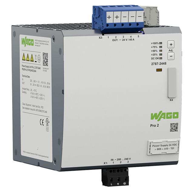 This is manufactured by WAGO Corporation. The manufacturer part number is 2787-2448. It is assigned with possible HTSUS value of 8504.40.9540. The product is rohs3 compliant. It has a 24v output voltage. The product features power and watts of 960w. The maximum product's output current is 40a. It is approved by ce, ul. It carries ac input type. The product is widely employed in laboratory. In addition, it is reach unaffected. It is a highly efficient product with an 96% of high efficiency. It is shipped in box package . The product's diameters include 5.12" l x 4.72" w x 5.12" h (130.0mm x 120.0mm x 130.0mm). It has a long 12 weeks standard lead time. 3.51 kv of isolation voltage. The product has an AC input voltage range of 180 ~ 264 vac. Its typical moisture sensitivity level is not applicable. The splendid features of the product include adjustable output, ip20, pfc, universal input. The product has -25°c ~ 70°c operating temperature range. Standard number include: 61010-1. Additionally, the product is supplied with 1 outputs. The product is designated with the ear99 code number.