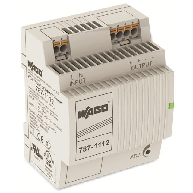This is manufactured by WAGO Corporation. The manufacturer part number is 787-1112. It is assigned with possible HTSUS value of 8504.40.9520. Additionally, the product is supplied with 1 outputs. The product features power and watts of 60w. The maximum product's output current is 2.5a. It is approved by curus, eac, ul. It carries ac or dc input type. The product is widely employed in industrial, ite (commercial), laboratory. It has a 24v output voltage. It is a highly efficient product with an 88% of high efficiency. It has 300v of maximum DC input voltage. It is shipped in box package . While the minimum DC input voltage is 120v. The product's diameters include 2.17" l x 2.83" w x 3.50" h (55.0mm x 72.0mm x 89.0mm). 4.242 kv of isolation voltage. The product has an AC input voltage range of 85 ~ 264 vac. Its typical moisture sensitivity level is not applicable. The splendid features of the product include adjustable output, ip20, pfc, universal input. The product has -25°c ~ 70°c operating temperature range. Standard number include: 60950-1; 61010-1; ul 508. The product is designated with the ear99 code number.