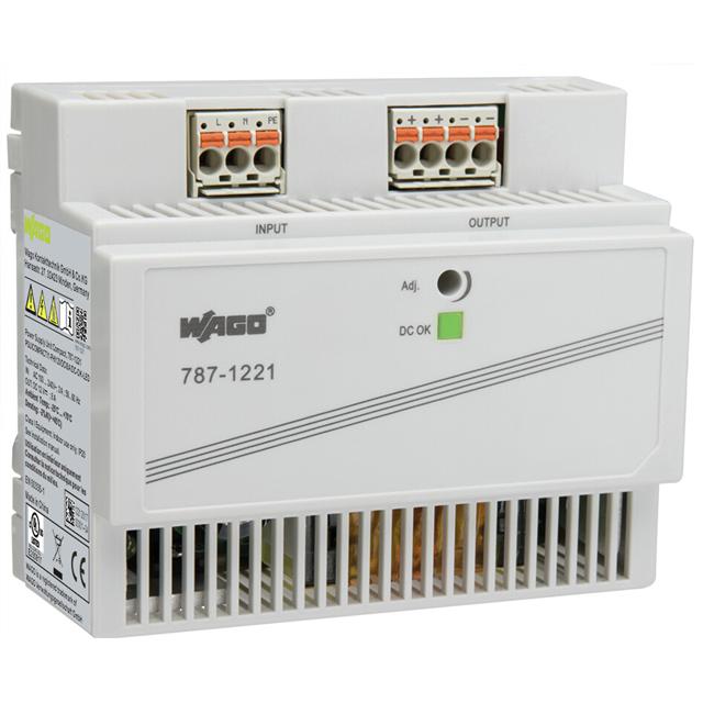 This is manufactured by WAGO Corporation. The manufacturer part number is 787-1221. It is assigned with possible HTSUS value of 8504.40.9520. The product is rohs3 compliant. The product features power and watts of 96w. The maximum product's output current is 8a. It is approved by ce, eac, ul. It carries ac or dc input type. The product is widely employed in household appliances, industrial, ite (commercial). It has a 12v output voltage. It is a highly efficient product with an 91.5% of high efficiency. It has 375v of maximum DC input voltage. It is shipped in box package . While the minimum DC input voltage is 125v. The product's diameters include 2.07" l x 4.25" w x 2.07" h (52.5mm x 108.0mm x 52.5mm). It has a long 12 weeks standard lead time. 4.242 kv of isolation voltage. The product has an AC input voltage range of 90 ~ 264 vac. Its typical moisture sensitivity level is not applicable. The splendid features of the product include adjustable output, ip20, pfc, universal input. The product has -25°c ~ 70°c operating temperature range. Standard number include: 60335-1; ul 508. Additionally, the product is supplied with 1 outputs. The product is designated with the ear99 code number.