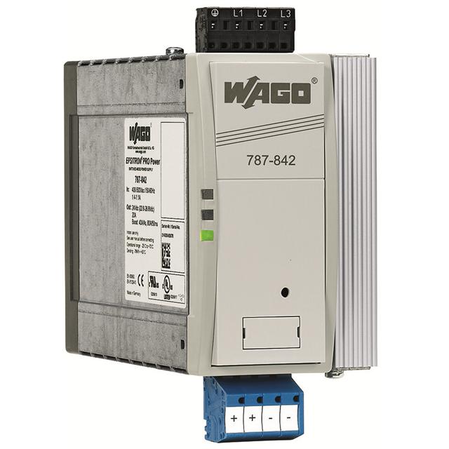 This is manufactured by WAGO Corporation. The manufacturer part number is 787-842. It is assigned with possible HTSUS value of 8504.40.9530. The product is rohs3 compliant. The product features power and watts of 480w. The maximum product's output current is 20a. It is approved by curus, eac, ul. It carries ac or dc input type. The product is widely employed in industrial, ite (commercial). It has a 24v output voltage. It is a highly efficient product with an 92.9% of high efficiency. It has 780v of maximum DC input voltage. It is shipped in box package . While the minimum DC input voltage is 480v. The product's diameters include 7.05" l x 3.03" w x 6.73" h (179.0mm x 77.0mm x 171.0mm). It has a long 12 weeks standard lead time. 4.242 kv of isolation voltage. The product has an AC input voltage range of 340 ~ 550 vac. Its typical moisture sensitivity level is not applicable. The splendid features of the product include adjustable output, ip20, pfc, universal input. The product has -25°c ~ 70°c operating temperature range. Standard number include: 60950-1; ul 508. Additionally, the product is supplied with 1 outputs. The product is designated with the ear99 code number.