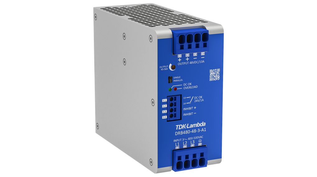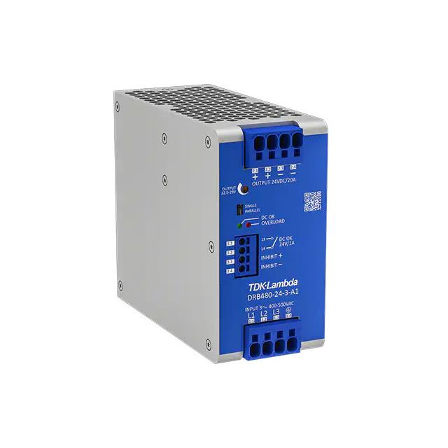 This is manufactured by TDK-Lambda. The manufacturer part number is DRB480-24-3-A1. Features a 24v output voltage. It has a/an dc output voltage . It carries 20a output current. The product drb, is a highly preferred choice for users. It has ac input voltage. Its input voltage is 400 → 500v. Its electrical phase configuration includes 3. It comes in din rail power supply configuration. It is assigned with possible HTSUS value of 8504.40.9530. The product is rohs3 compliant. It has a 24v output voltage. The product features power and watts of 480w. The maximum product's output current is 20a. It carries ac input type. In addition, it is reach affected. It is a highly efficient product with an 95.1% of high efficiency. The product is widely employed in ite (commercial), laboratory. The tdk-lambda's product offers user-desired applications. Does it require minimum load? no. The product's diameters include 5.86" l x 2.56" w x 5.08" h (148.8mm x 65.1mm x 129.0mm). It has a long 16 weeks standard lead time. The product has an AC input voltage range of 350 ~ 575 vac (3 phase). Its typical moisture sensitivity level is 1 (unlimited). The splendid features of the product include adjustable output, pfc, remote on/off, remote sense. The product drb480-3 (480w), is a highly preferred choice for users. The product has -25°c ~ 55°c operating temperature range. In addition, bulk is the available packaging type of the product. Standard number include: 60950-1; 61010-1; 62368-1. Additionally, the product is supplied with 1 outputs. The product is designated with the ear99 code number.