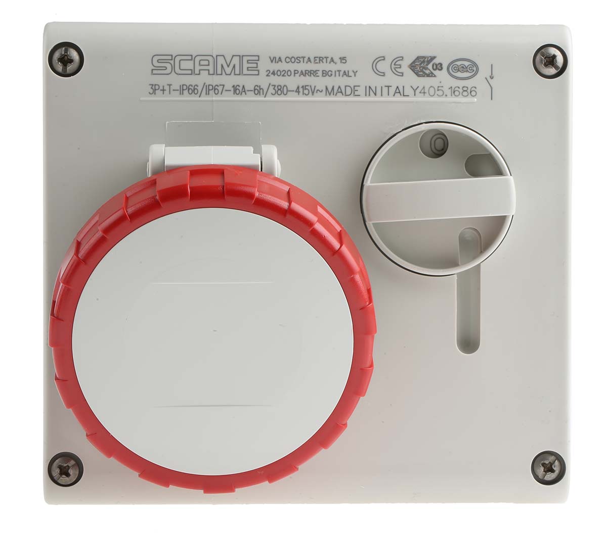 This is Right Angle Switchable IP66 IP67 Industrial Interlock Socket 3P+E Earthing Position 6h 16A 415 V manufactured by Scame. The manufacturer part number is 505.1686. The product has a current rating of 16a. The given dimensions of the product include 136 x 125 x 210mm. It is IP rated with ip66, ip67. It has a decent red colour. Moreover, the product has a nominal 415 v voltage rating. While the pole has 3p+e format. Its accurate length is 136mm. Furthermore, the product is 125mm wide. The product comes in 210mm depth. It comprises a socket. Moreover, it is switchable yes . Additionally, it has 6h earthing position . The product's body is nicely designed from polymer materials. It has right angle body orientation.