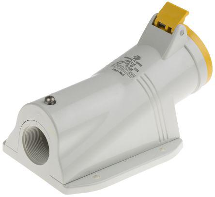 This is IP44 Yellow Surface Mount 2P+E Right Angle Industrial Power Socket Rated At 32A 100 → 130 V manufactured by RS Pro. The manufacturer part number is 668-5402. The product has a current rating of 32.0a. The product is available in wall mount configuration. It is IP rated with ip44. In addition, female is the available "Gender" of the product. It has a decent yellow colour. Moreover, the product has a nominal 110.0 v voltage rating. While the pole has 2p+e format. It comprises a socket. Whereas, the minimum operating temperature of the product is -25. It has a maximum operating temperature of +40°c. It has right angle body orientation.