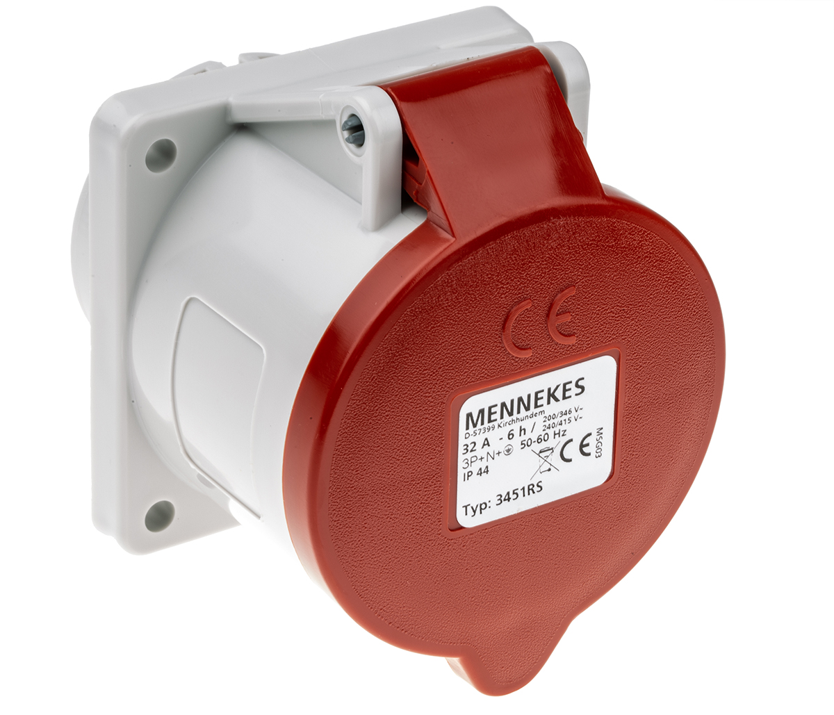 This is IP44 Red Panel Mount 5P Industrial Power Socket Rated At 32A 400 V manufactured by Mennekes. The manufacturer part number is 3451. The product has a current rating of 32a. The product is available in panel mount configuration. It is IP rated with ip44. In addition, female is the available "Gender" of the product. It has a decent red colour. Moreover, the product has a nominal 400 v voltage rating. While the pole has 5p format. It comprises a socket. Whereas, the minimum operating temperature of the product is -25. It allows screw terminal termination method. The cross section area of the cable includes 2.5 → 10mm². It has a maximum operating temperature of +55°c. It has straight body orientation. It has low voltage no .
