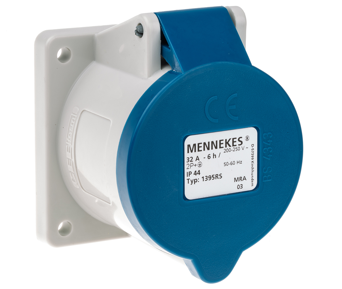 This is IP44 Blue Panel Mount 3P Industrial Power Socket Rated At 32A 230 V manufactured by Mennekes. The manufacturer part number is 1395. The product has a current rating of 32a. The product is available in panel mount configuration. It is IP rated with ip44. In addition, female is the available "Gender" of the product. It has a decent blue colour. Moreover, the product has a nominal 230 v voltage rating. While the pole has 3p format. It comprises a socket. Whereas, the minimum operating temperature of the product is -25. It allows screw terminal termination method. The cross section area of the cable includes 2.5 → 10mm². It has a maximum operating temperature of +55°c. It has straight body orientation. It has low voltage no .